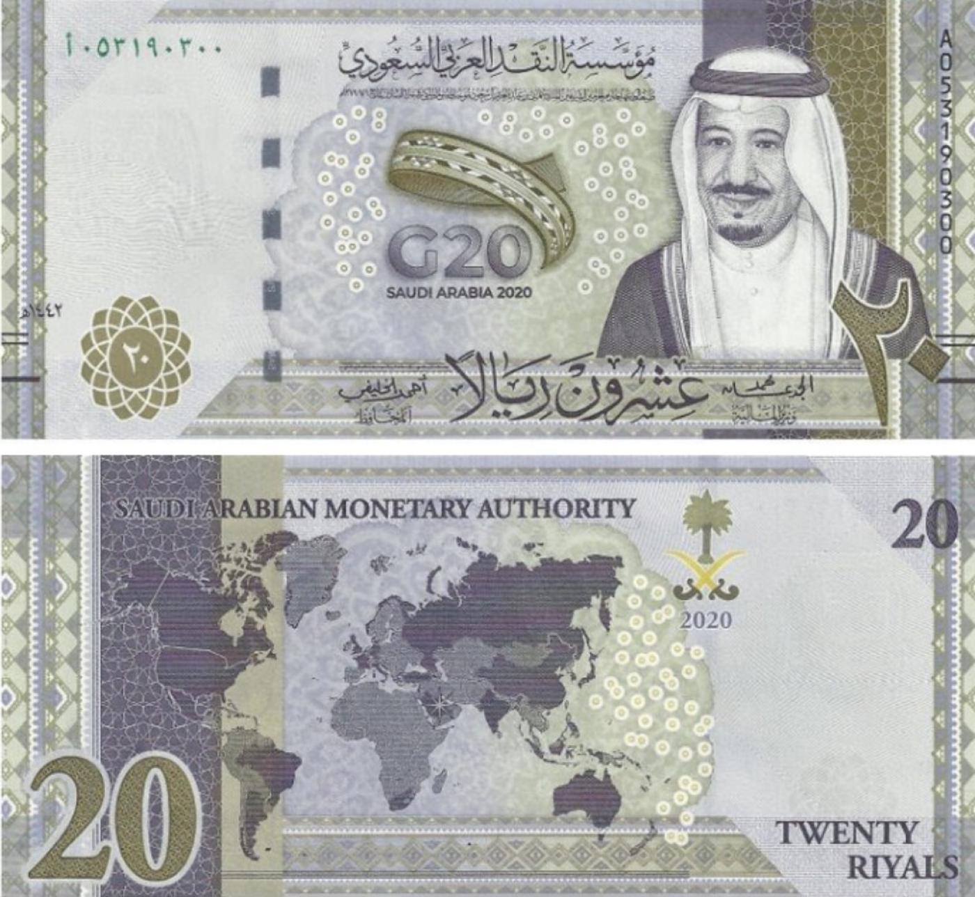 Uang kertas yang dicetak minggu lalu oleh Otoritas Moneter Arab Saudi, memiliki potret satu muka kertas uang Raja Salman dan muka kertas lainnya logo KTT Saudi G20 dengan background peta dunia yang dibuat secara artistik di sisi lain.